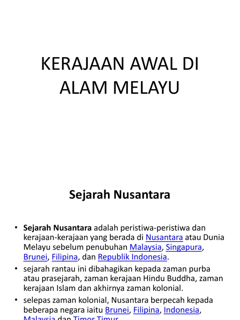 Easy to change colors photos and Text. Malaysia termasuk di dalam Alam Melayu yang memiliki Sejarah yang unik menerusi Kemunculan kerajaan awal yang setanding dengan tamadun lain di dunia. Sinopsis Alam Melayu merupakan kawasan yang merangkumi kepulauan dan tanah besar.